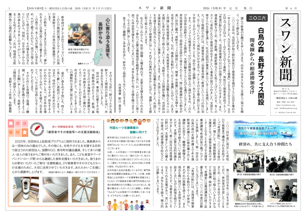2026年1月1日 / 最終更新日時 : 2026年1月1日 じむちょーさん 定期報告 2026 スワン新聞 第六号 新年あけましておめでとうございます。おかげさまで今年もスワン新聞を発行することができました。本年もどうぞよろしくお願い申し上げます。 スワン新聞 第六号 p.1 スワン新聞 第六号 p.2 FacebookX コメントを残す コメントをキャンセルメールアドレスが公開されることはありません。 ※ が付いている欄は必須項目ですコメント ※ 名前 ※ メール ※ サイト 次回のコメントで使用するためブラウザーに自分の名前、メールアドレス、サイトを保存する。 Δ